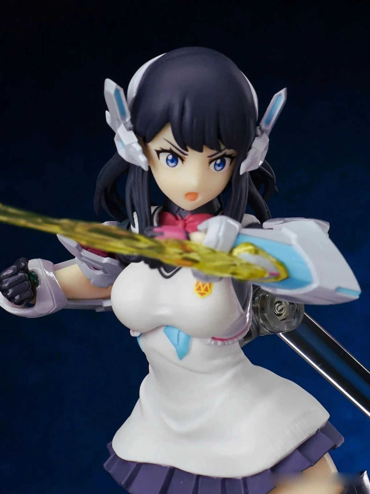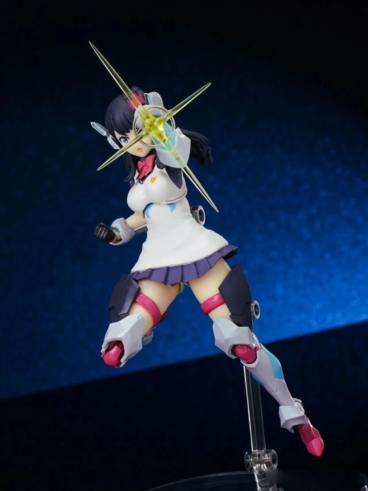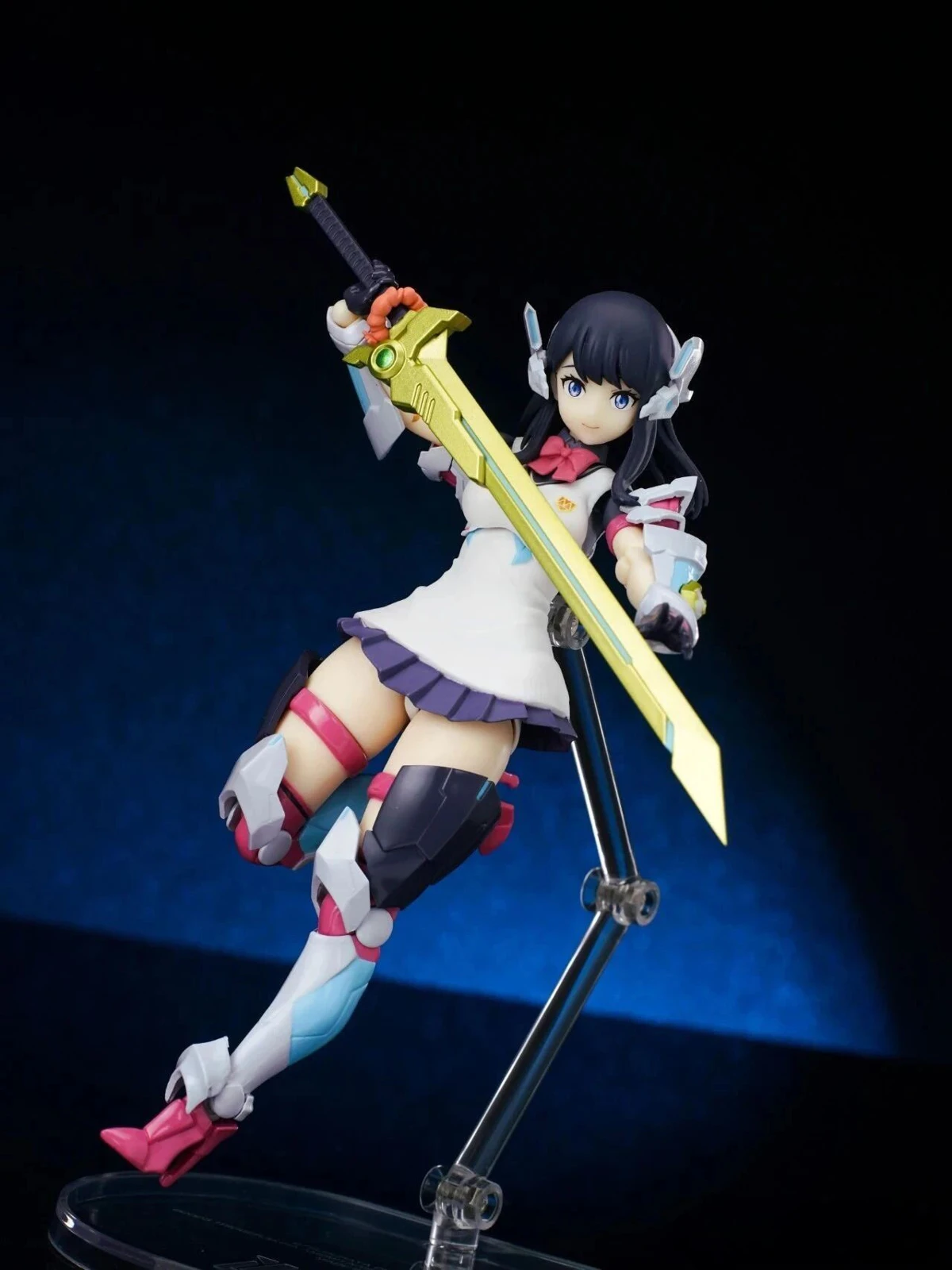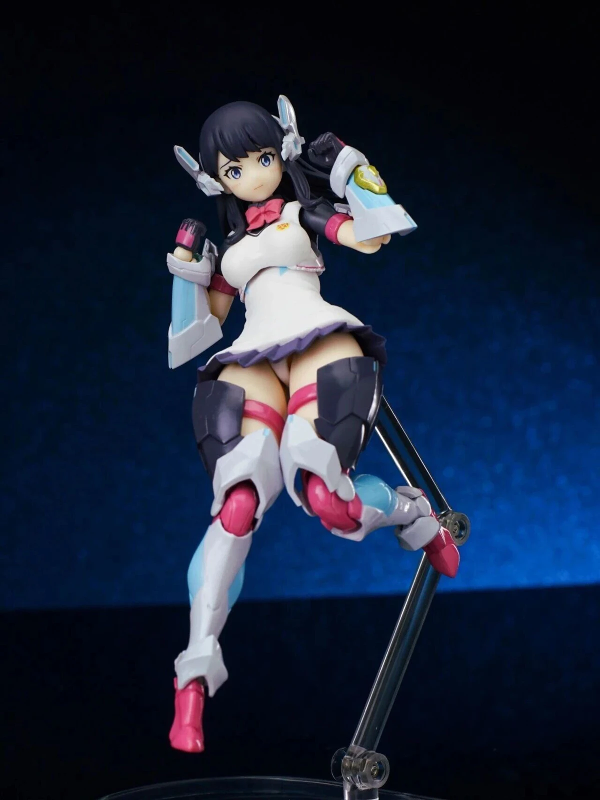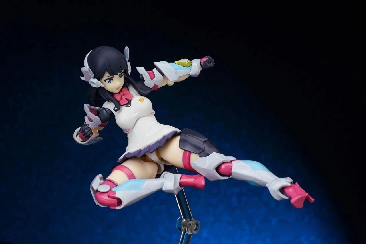 The figure stands approximately 15 cm tall. The design combines Rikka’s school uniform appearance from Gridman Universe with armor elements inspired by “Hyper Agent Gridman.” Additional outer armor has been added to the limbs, while the headset-like headpiece is derived from Gridman’s crest.