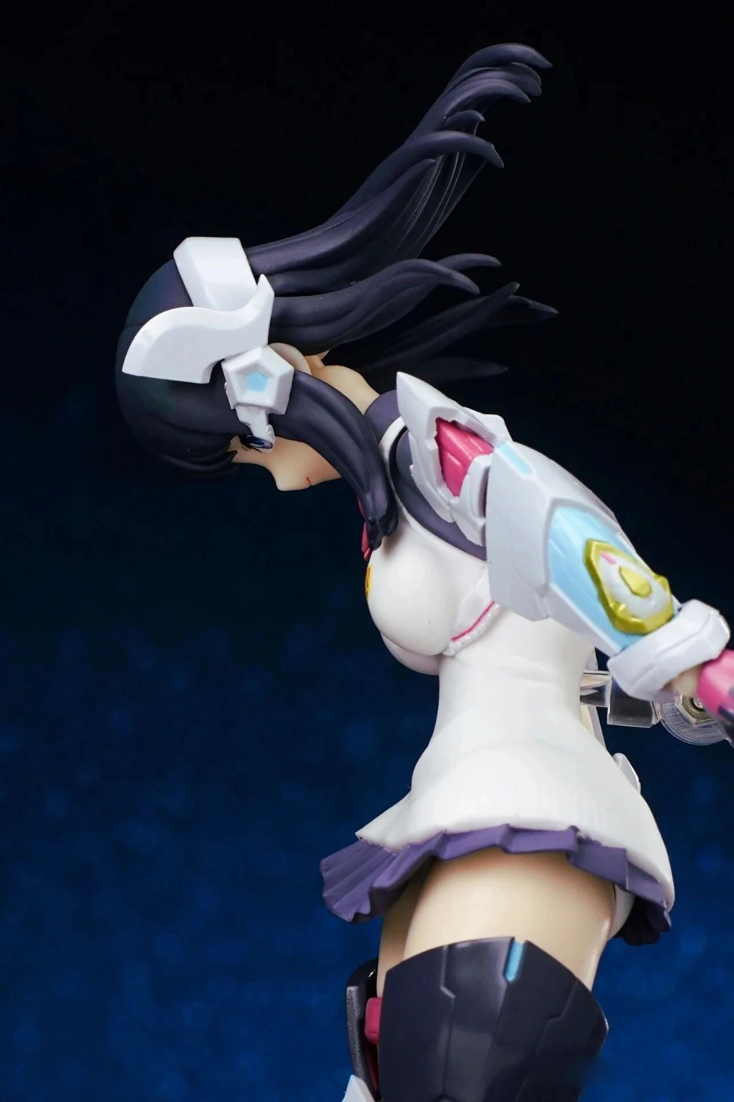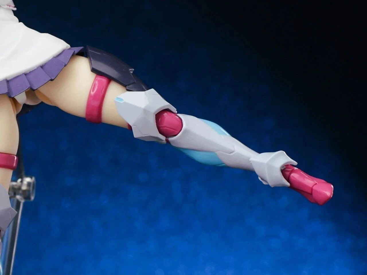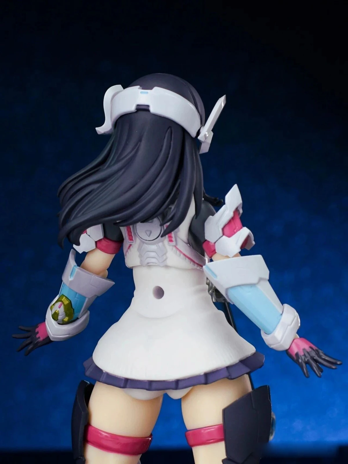 The exposed thighs beneath the ultra-short skirt, paired with the outer armor, create a striking “absolute territory” look. The thigh strap details also cleverly transition around the thigh swivel joint. A subtle glimpse of white undergarments is also part of Rikka’s charm.