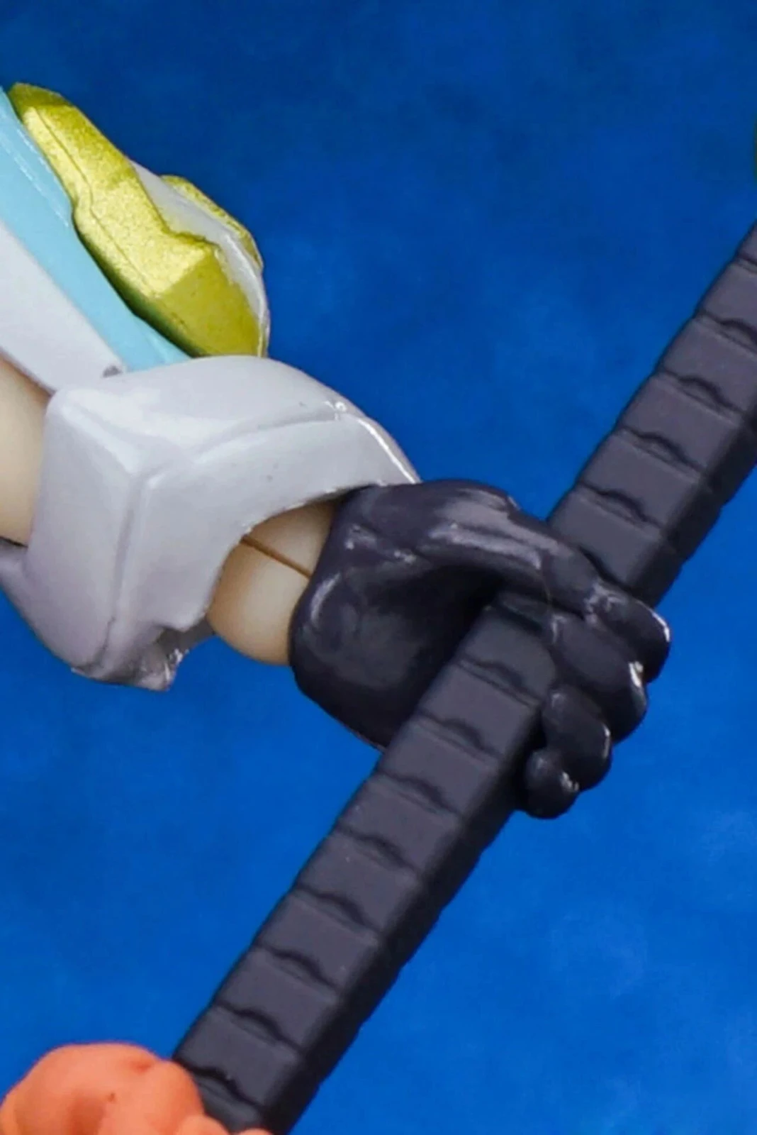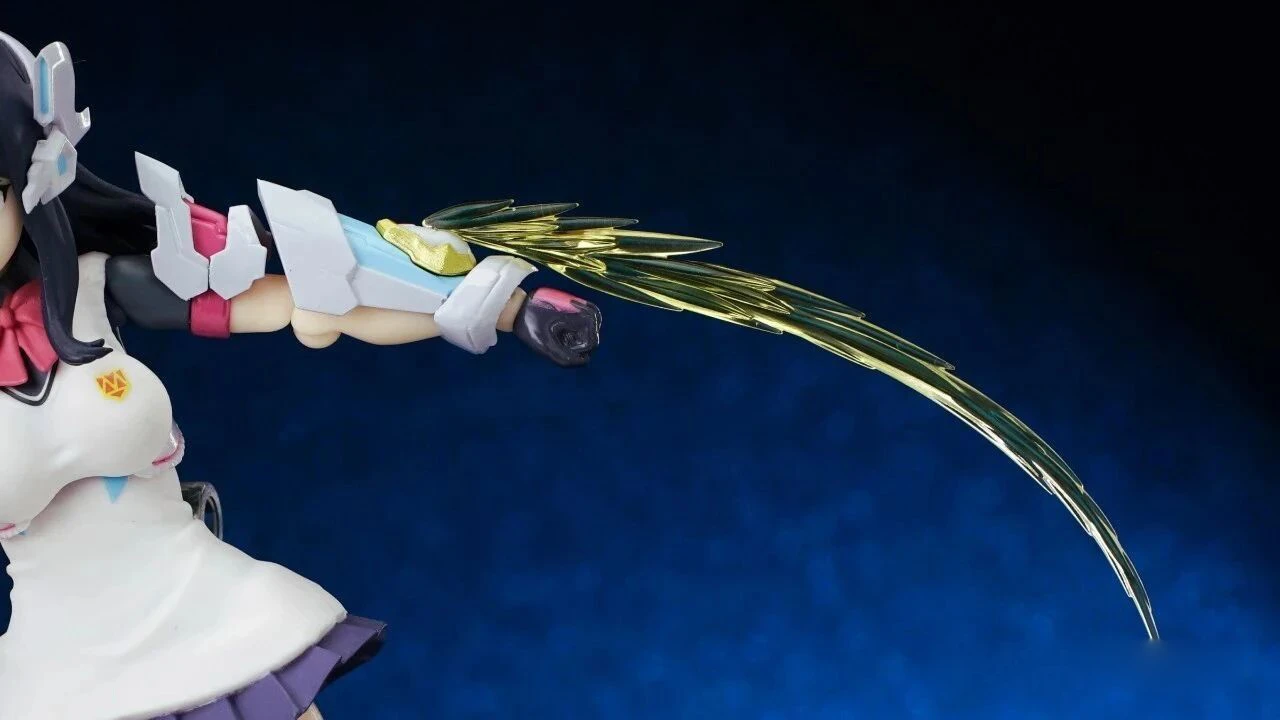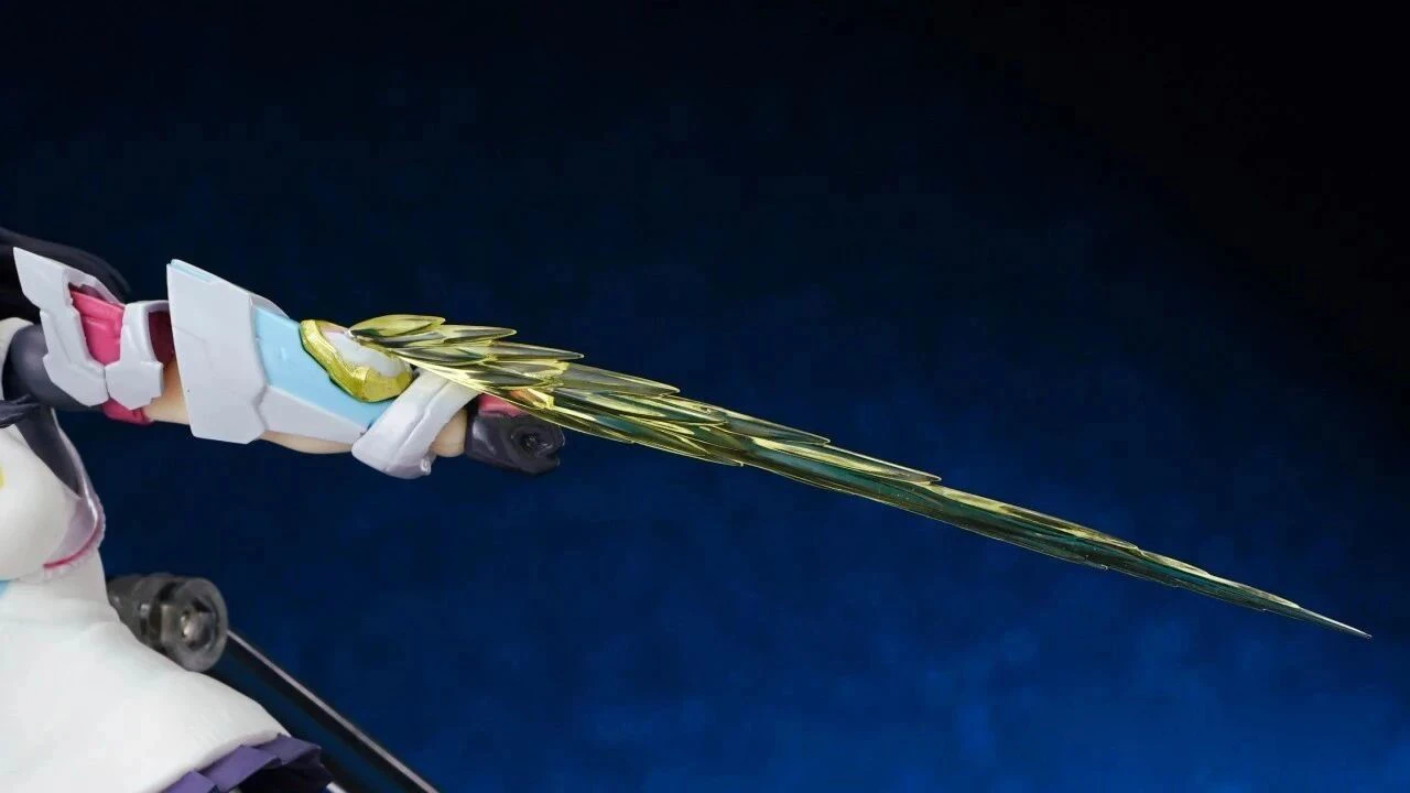 The only weapon included is “SAMURAI CALIBUR,” which features Rikka’s orange bird bracelet wrapped around it. The blade design is slightly slimmer than Gridman’s version and includes blue-green color separation details along the center.