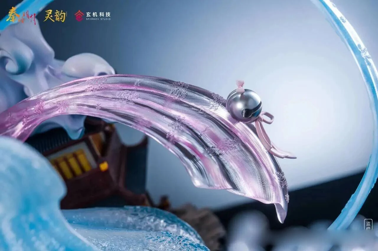 LingYun Studio invested significant effort into detailing. The pink translucent ribbons feature small bells, while behind Xuenu stands a glass-like decorative structure combining a moon motif with miniature Mechanism City architecture. These elements enrich the overall presentation while staying true to her character.