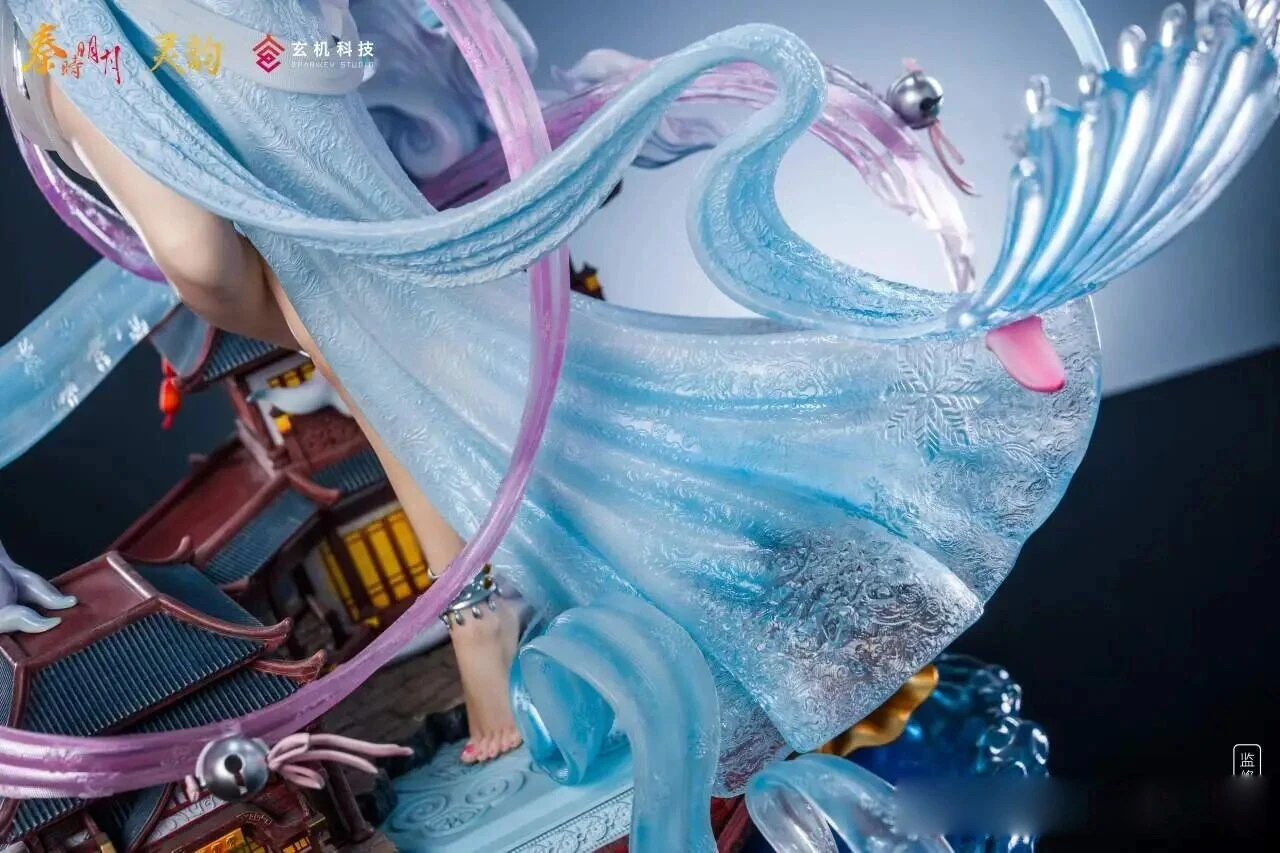 The statue recreates Xuenu dancing at Feixue Pavilion. She stands gracefully upon a miniature scene base inspired by the pavilion setting. The composition balances movement and stillness, with her garments flowing gently and sculpted in smooth, cloud-like lines. The color scheme centers on icy white and pale blue, expressing a cool elegance that aligns perfectly with the “Flying Snow & Jade Blossom” theme.